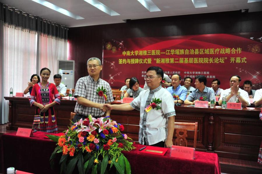 2013年6月19日,中南大學(xué)湘雅三醫(yī)院為江華縣人民醫(yī)院授牌“中南大學(xué)湘雅三醫(yī)院技術(shù)指導(dǎo)醫(yī)院”,與江華縣人民政府簽署醫(yī)療幫扶戰(zhàn)略協(xié)議,與江華縣人民醫(yī)院簽署醫(yī)療幫扶合作協(xié)議,拉開(kāi)健康扶貧的序幕。